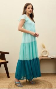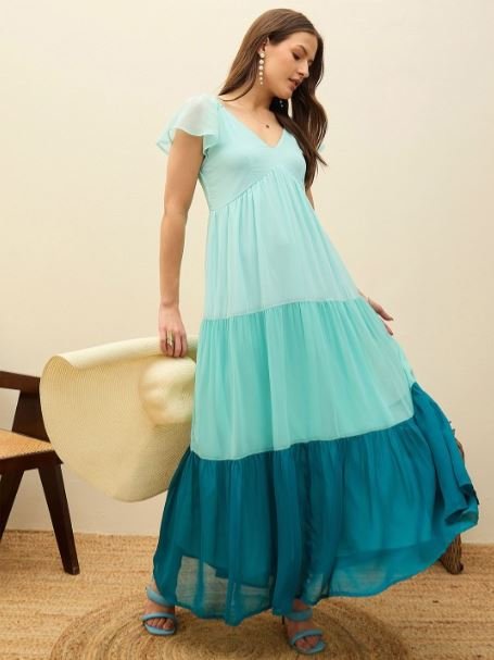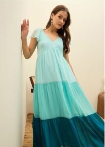 Be the first to review “Blue Colourblocked Printed Frill Sleeve Fit & Flare Maxi Dress”